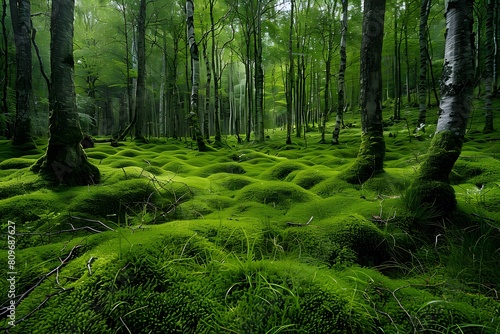 © Valentin, Obraz premium Moss covered forest floor with trees and foliage