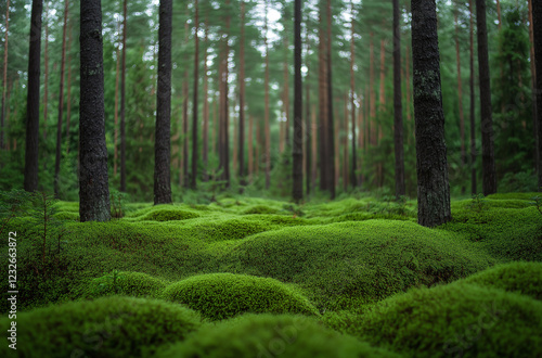 © Aleena , Fototapeta premium Moss-covered ground in the forest, surrounded by tall trees.