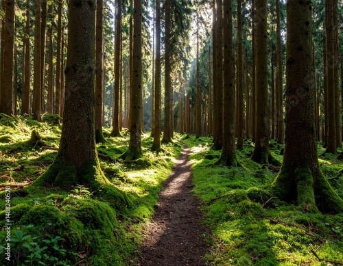 Fototapeta premium Moss-Covered Pathway Through a Dense Forest, Sunlight filtering through tall...