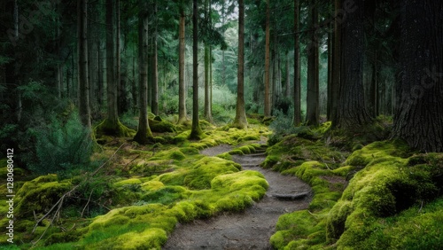 Fototapeta premium Moss-covered pathway winding through dense green forest with tall trees and...