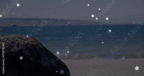 Fototapeta premium Moss-covered rock resting on sandy beach, with gentle waves and star-shaped overlays, copy space