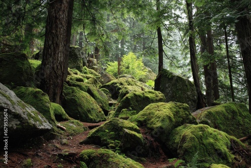 © GoshaMovies, Naklejka premium Moss-covered rocks in old-growth forest