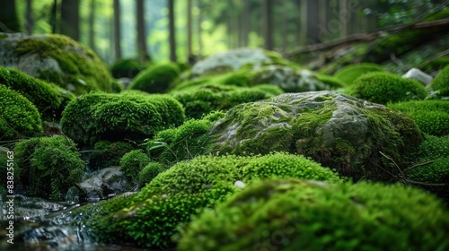 Obraz premium Moss-covered rocks with a lush, green texture, surrounded by a serene forest...