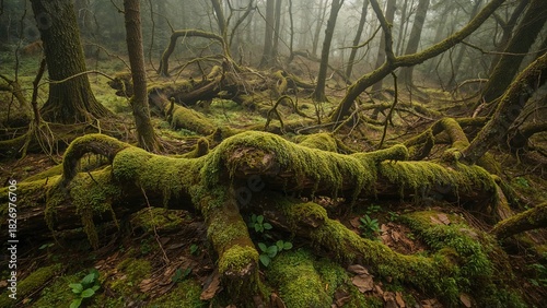 © Lasvu, Naklejka premium Moss-covered roots and tangled branches in a foggy forest landscape.