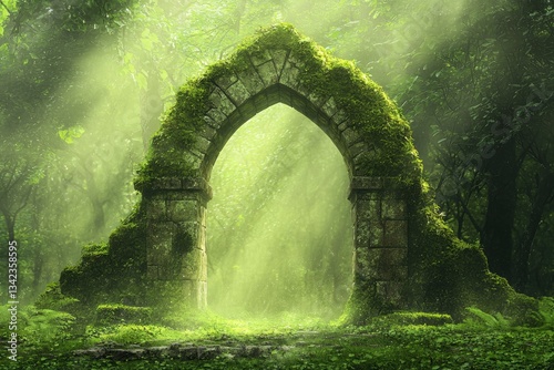 Fototapeta premium Moss-covered stone archway in an enchanted forest, bathed in sunlight, leads...