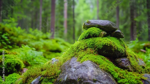 © voranun, Fototapeta premium Moss-Covered Stone in Tranquil Forest Setting