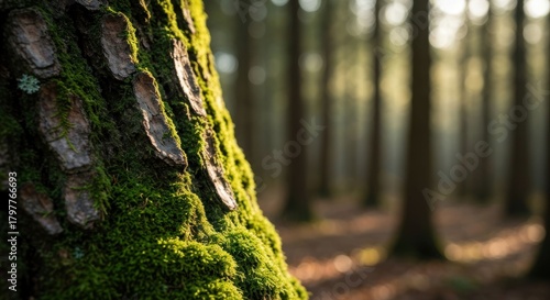 © andi, Obraz premium Moss-covered tree trunk in sunlight, with a blurred forest backdrop