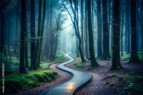 © Introvertia, Fototapeta premium Moss-covered trees along winding path in foggy forest
