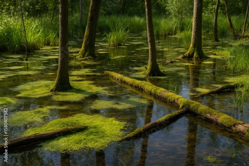© AkuAku, Obraz premium Moss-covered wetlands within a pond ecosystem