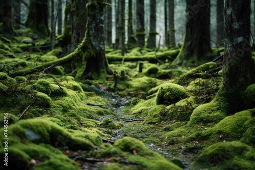 Naklejka premium Moss covering a forest floor, mixed with fallen pine needles