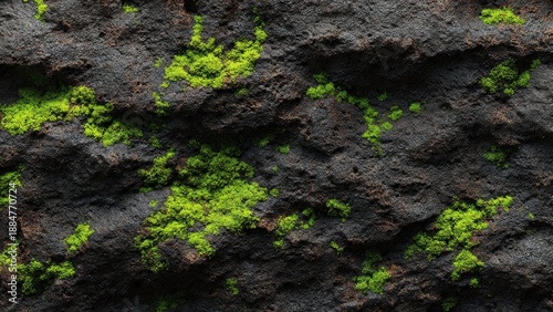 © darshika, Fototapeta premium Moss growing on dark rough stone surface texture