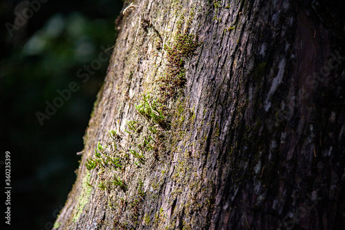© JAMES, Obraz premium Moss grows on a tree trunk in the forest.
