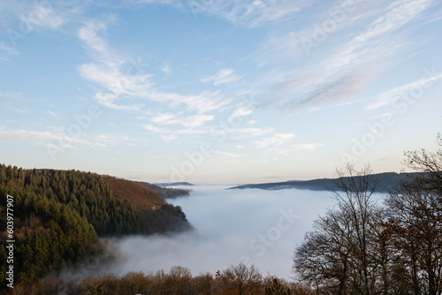 Fototapeta premium mosselle valley wine region in Germany filled with morning mist fog just after sunrise before the sun burns it off. dragons breath creates dreamy effect in natural beauty with perfect blue sky