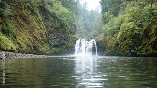 Fototapeta premium Mossy canyon waterfall, lush forest stream, cascading river through rocks, serene wilderness greenery landscape, misty nature cascade, scenic mountain water flow.