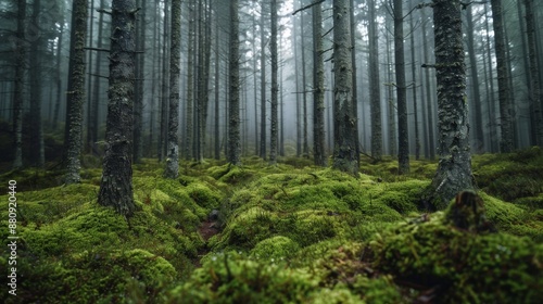 © Habibur Rahaman, Obraz premium Mossy coniferous forest in a foggy day.