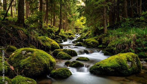 Obraz premium Mossy creek flowing through forest