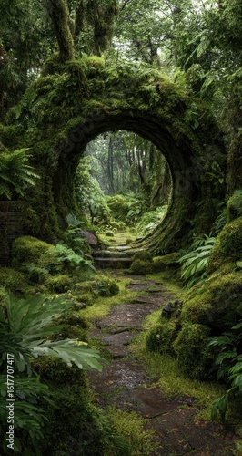 Naklejka premium Mossy stone archway path, rainforest, mystical, nature scene, fantasy travel...