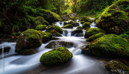Fototapeta premium Mossy stream cascading over rocks in a lush forest