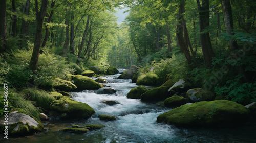 © mei, Fototapeta premium Mossy Stream Flowing Through a Serene Forest