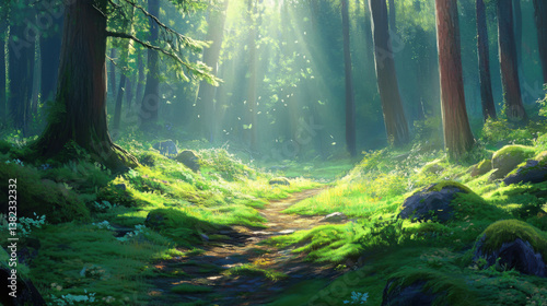 © Thanatphong, Obraz premium Mossy trail in sunlit forest