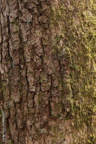 © Kyran, Fototapeta premium Mossy Tree Bark Natural Texture Background Green Foliage