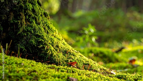 © Neli, Fototapeta premium Mossy tree base in a forest, with dappled light creating depth and texture