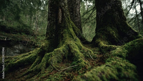 Obraz premium Mossy Tree Roots in a Lush Forest