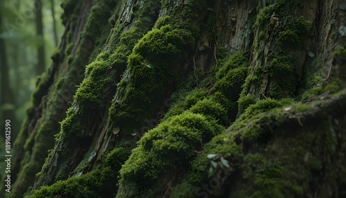 © abestock, Fototapeta premium Mossy Tree Trunks in Misty Woodland Light