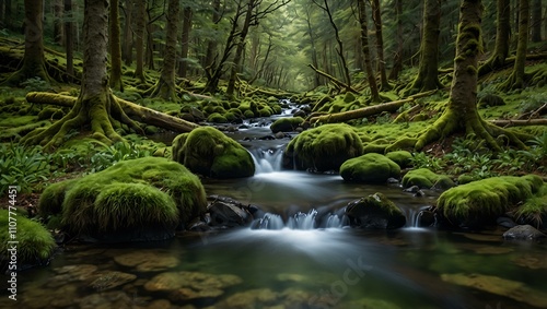 Obraz premium Mossy trees beside a green forest stream.