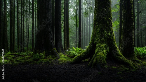 © Enggal Pitoyo, Obraz premium Mossy trees in a misty forest.