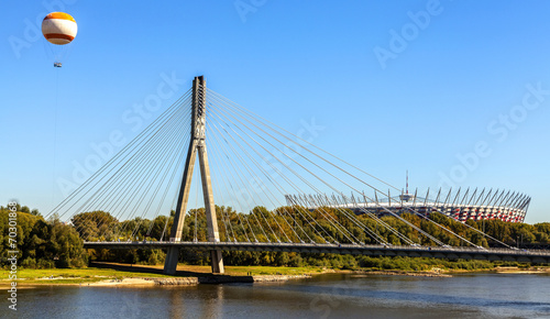 Obraz premium Most, balon na ogrzane powietrze i stadion nad Wisłą w Warszawie