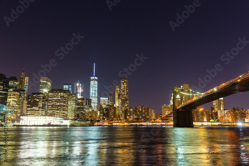 Naklejka premium Most Brookliński i nabrzeże Manhattanu nocą