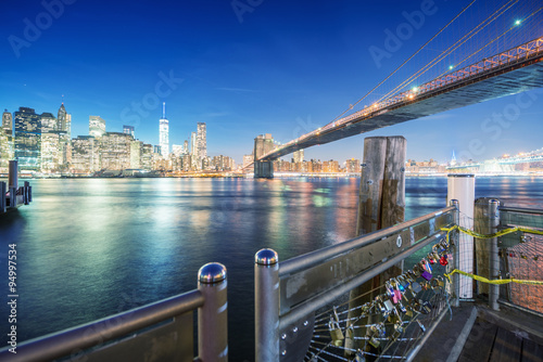 © jovannig, Fototapeta premium Most Brookliński nocą z panoramą Dolnego Manhattanu z Brook
