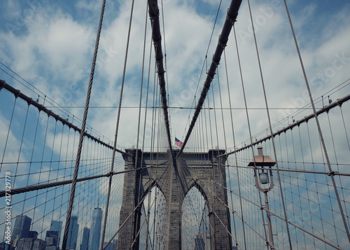 © art4stock, Naklejka premium Most Brookliński z panoramicznym widokiem na Nowy Jork. Sceneria w centrum dolnego Manhattanu, Nowy Jork, USA.