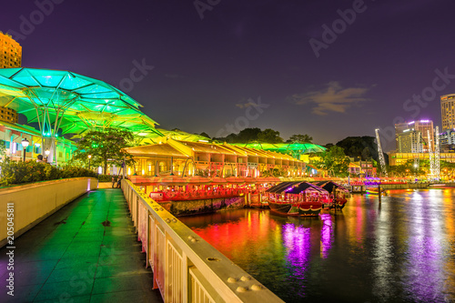 © bennymarty, Fototapeta premium Most Clarke Quay i obszar Riverside wieczorem w Singapurze, w Azji Południowo-Wschodniej. Waterfront skyline odzwierciedlenie na rzece Singapur. Popularna atrakcja nocnego życia.