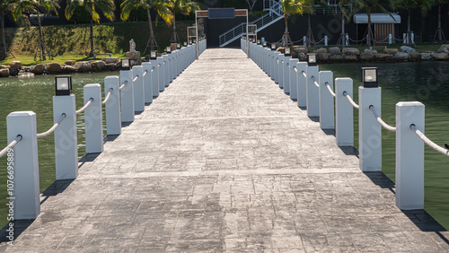 © Chalothorn, Fototapeta premium Most filarowy wykonany z betonu z dużymi barierkami linowymi po dwóch stronach
