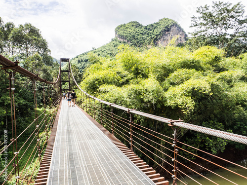 © bambambu, Fototapeta premium Most linowy, sposoby na przeprawę przez rzekę w niektórych miejscach podróży lub dżungli, popularne w ekstremalnych podróżach przygodowych