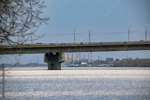 © Ilia Petukhov, Obraz premium Most transportu samochodowego na tle przemysłowej części miasta.