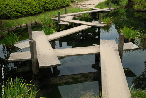 Fototapeta premium Most wykonany z desek drewnianych w ogrodzie japońskim
