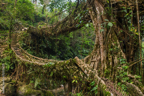 Obraz premium Most żyjących korzeni w pobliżu wioski Nongriat, Cherrapunjee, Meghalaya,...