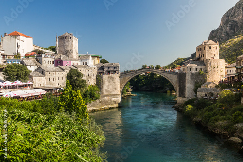 © Matyas Rehak, Fototapeta premium MOSTAR, BOSNIA AND HERZEGOVINA - JUNE 10, 2019: Stari most (Old Bridge) over Neretva river in Mostar. Bosnia and Herzegovina