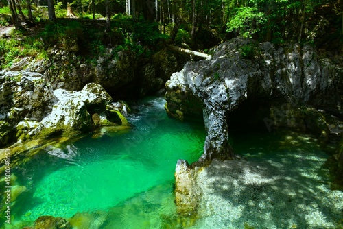 Naklejka premium Mostnica stream flowing next to Slonček rock formation at Korita Mostnice in...