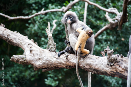 © orapin, Obraz premium Mother and baby Dusky leaf monkey, Spectacled Langur in Thailand