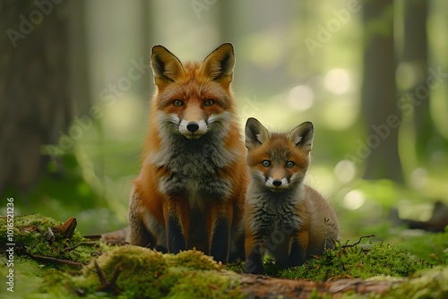 © D, Obraz premium Mother and Baby Foxes in Lush Forest - Wildlife Photography for Nature Prints
