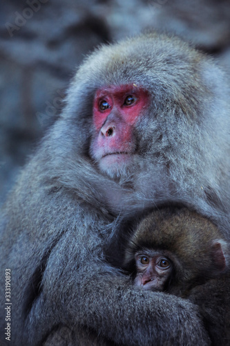 Naklejka premium Mother and Baby from Smow monkey family in the Jigokudani Park, Japan