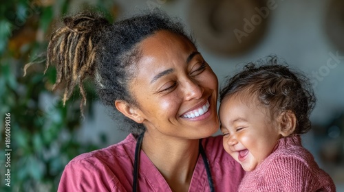 © Luba, Fototapeta premium Mother and Baby Laughing Together (Pink Scrubs)