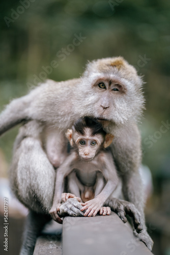 Naklejka premium mother and baby monkey looking at the camera