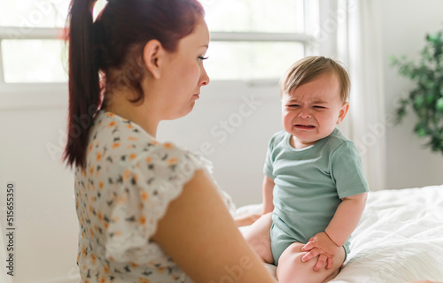 © Louis-Paul Photo, Fototapeta premium Mother and baby on white bed at home the baby crying