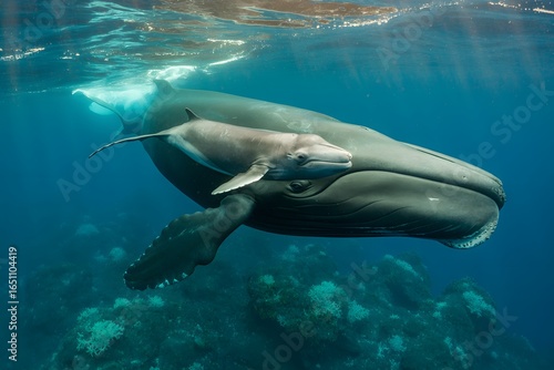© Musfik, Fototapeta premium Mother and calf right whale swimming together in blue ocean water