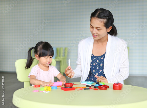 © zilvergolf, Fototapeta premium Mother and Child girl sitting at the table and plays artificial fruit.
